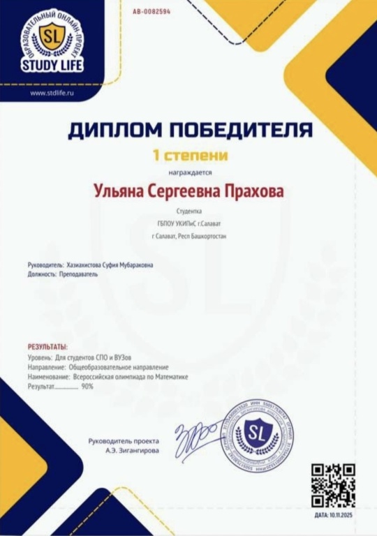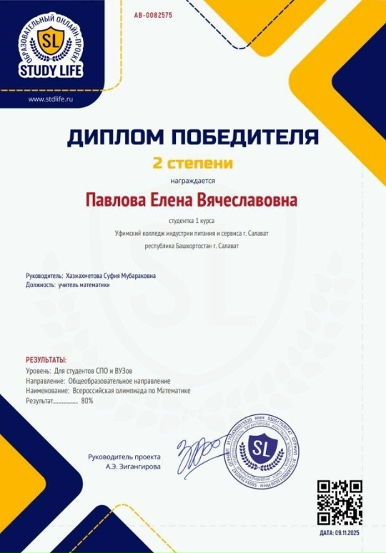 Студенты I курса Прахова У. и Павлова Е. стали победителями Всероссийской олимпиады по математике образовательного онлайн - проекта STUDY LIFE.